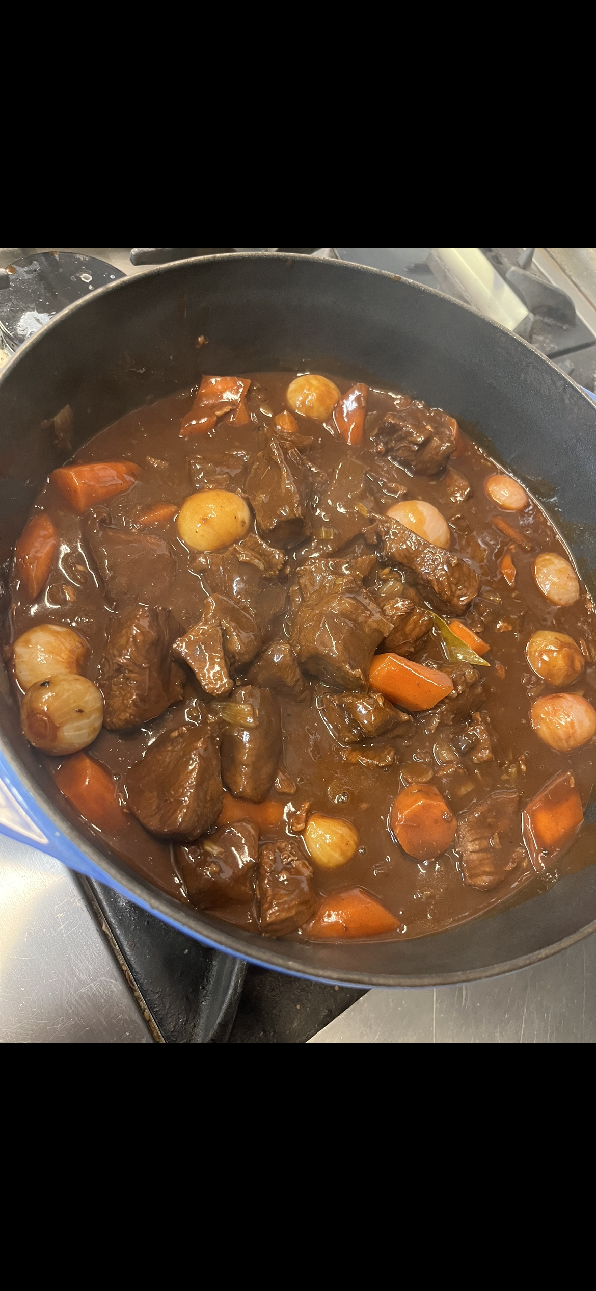 Delicious local beef slow cooked in a luxurious red wine sauce with shallots, mushrooms and Great Garnetts smoked bacon.